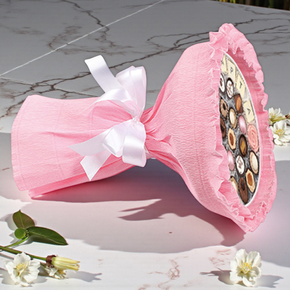 Представляем изысканный букет из конфет ручной работы в нежных розовых тонах — идеальное сочетание красоты, вкуса и душевного тепла. Это не просто сладости: это настоящее произведение кондитерского искусства, которое подарит незабываемые эмоции.