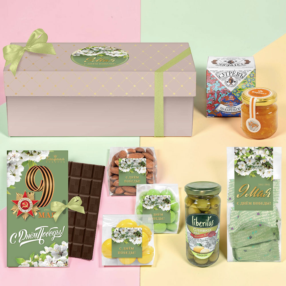 "9 мая" подарочный набор: шоколад, драже, оливки, чай, варенье