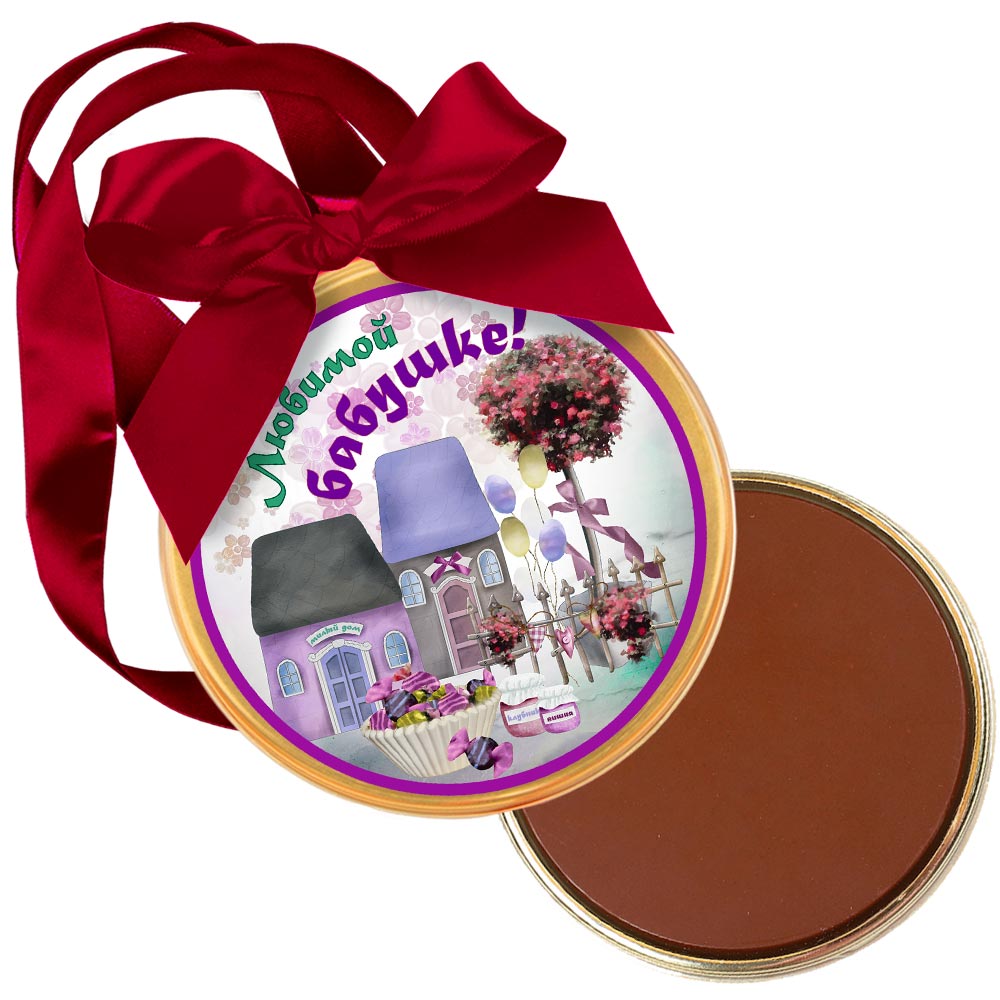 Элегантно оформленная медаль «Любимой бабушке!» изготовлена из молочного шоколада, полученного из какао-зёрен высокого качества.