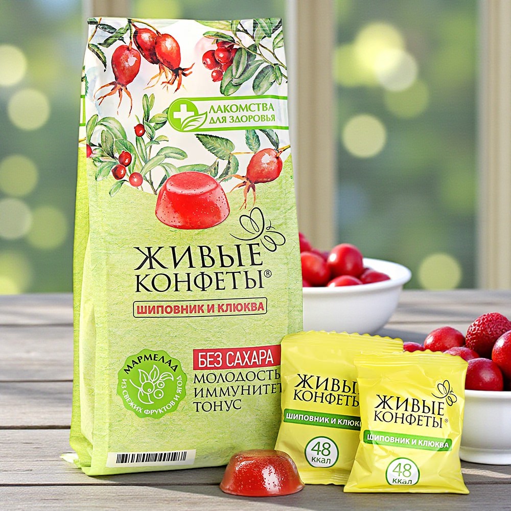 фруктоза, патока, клюква, сок шиповника, желирующий агент (агар), регулятор кислотности (лимонная кислота), консервант (сорбиновая кислота), подсластитель (экстракт стевии).