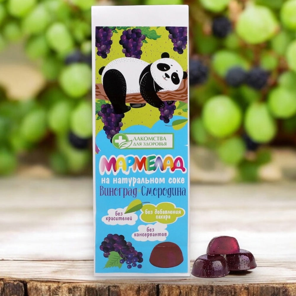 Состав: фруктоза, патока, сок винограда концентрированный, сок смородины концентрированный, желирующий агент (агар), регулятор кислотности (лимонная кислота).