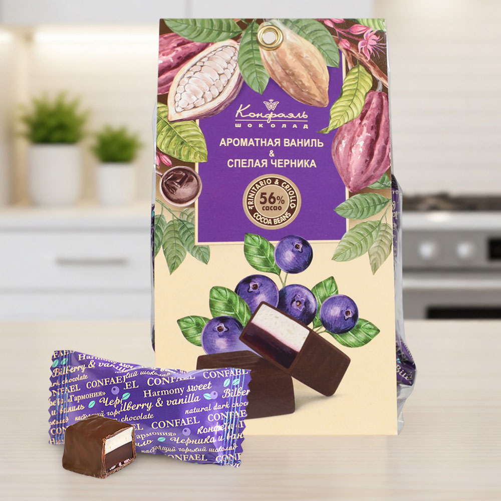 шоколадная масса - какао тертое, сахар, какао-масло, эмульгатор (лецитин соевый), ароматизатор ("Ванилин"), начинки - сахар, патока, молоко сгущенное (молоко цельное, сахар (сахароза, лактоза)), масло сладко-сливочное, натуральный концентрированный черничный сок, яичный белок сухой, желирующие агенты (агар, желатин говяжий), консервант (сорбиновая кислота), регулятор кислотности (лимонная кислота), эмульгатор (Е471), ароматизаторы, натуральный экстракт ванили.