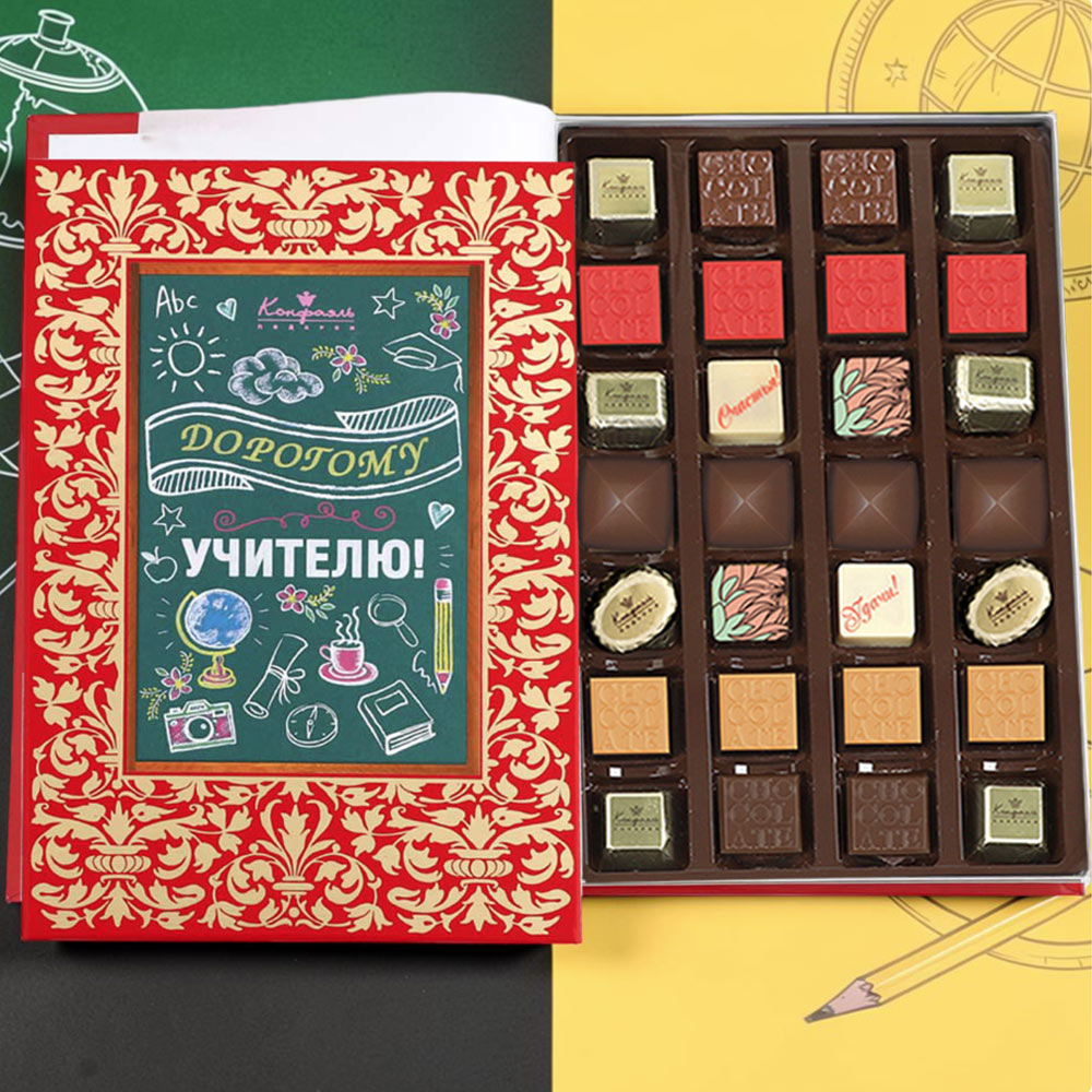 Дизайнерская коробка конфет от “Конфаэль”, стилизованная под книгу придётся по вкусу даже самому строгому преподавателю.