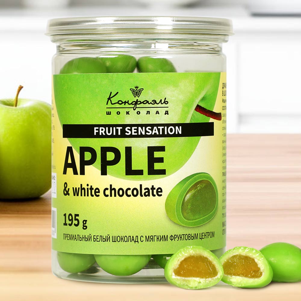 шоколадная масса - какао-масло, сахар, молоко сухое цельное, молоко сухое обезжиренное, лактоза, эмульгатор (лецитин соевый), ароматизатор ("Ванилин"); начинки - сахар, патока, натуральный концентрированный яблочный сок, желирующие агенты (агар, желатин), регулятор кислотности (лимонная кислота), ароматизатор, пищевой краситель "комплекс меднохлорофилов", глазирователь (капол).Энергетическая ценность на 100 г продукта: белков – 7,0 г; жиров – 23,0 г; углеводов – 62,0 г 480 ккал/1990 кДж