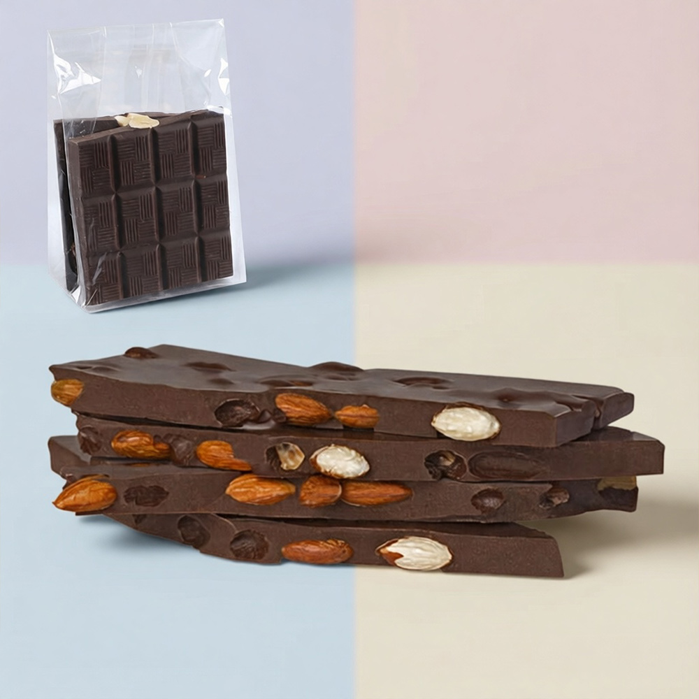 ядра орехов миндаля, какао-масло, какао тертое, сахар, эмульгатор (лецитин соевый), ароматизатор («Ванилин»)