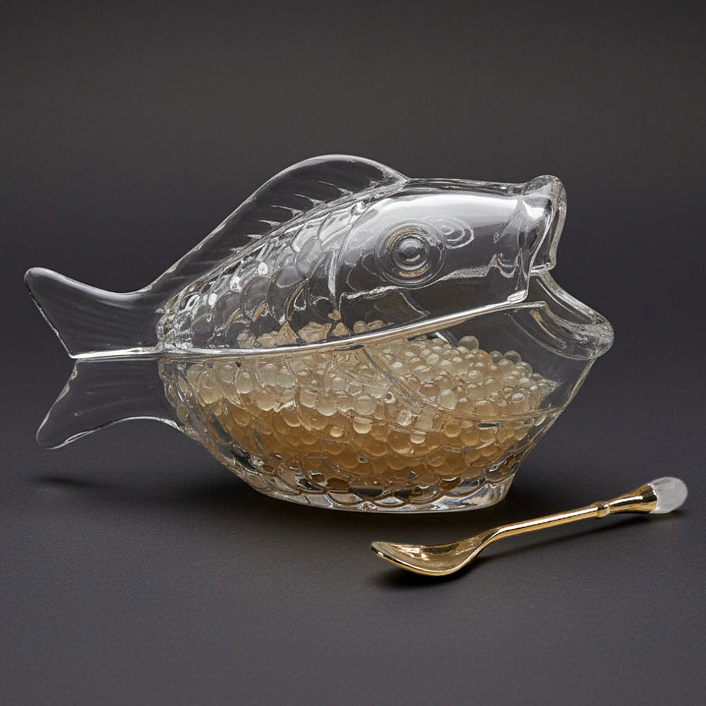 Уникальный дизайн. Форма рыбы придаёт изделию художественную выразительность: это не просто ёмкость для икры, а настоящий декоративный элемент.