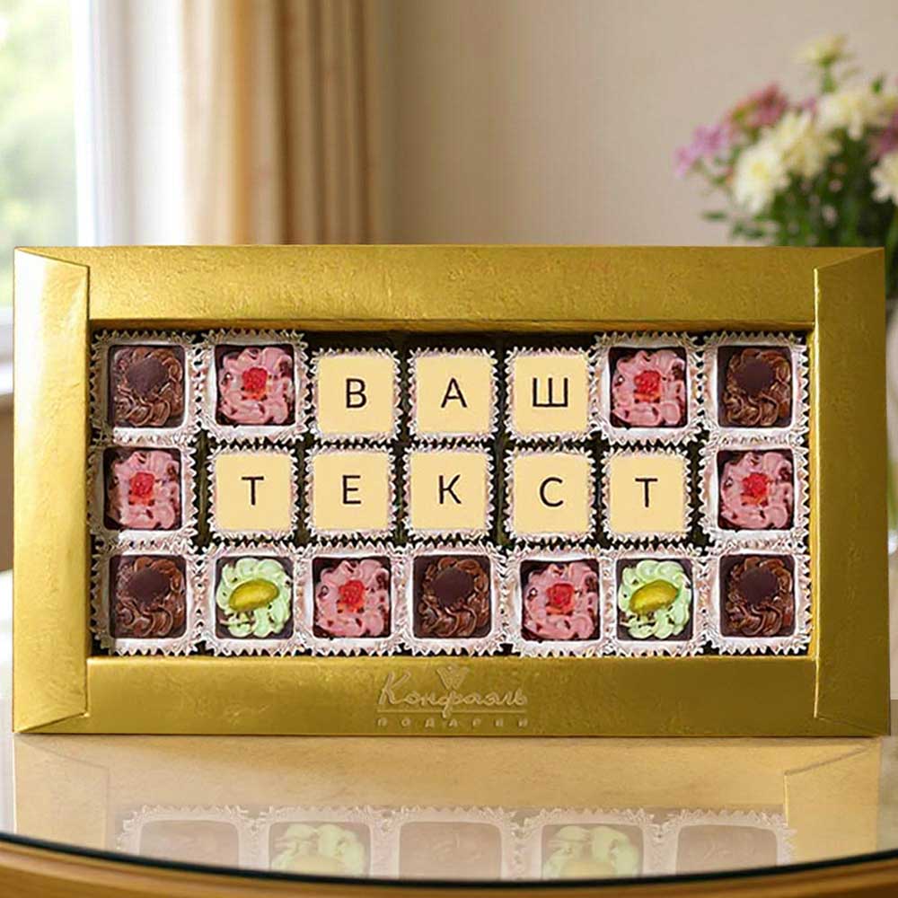 Текст выкладывается съедобной шоколадной мозаикой, которую с удовольствием съест получатель.