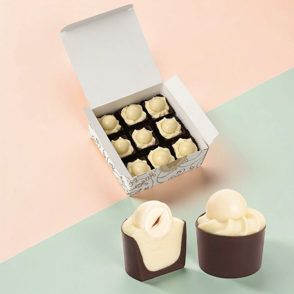 Каприччио -шоколадный стаканчик с начинкой из белого шоколадного крема, украшенная драже «Фундук в белом шоколаде»
