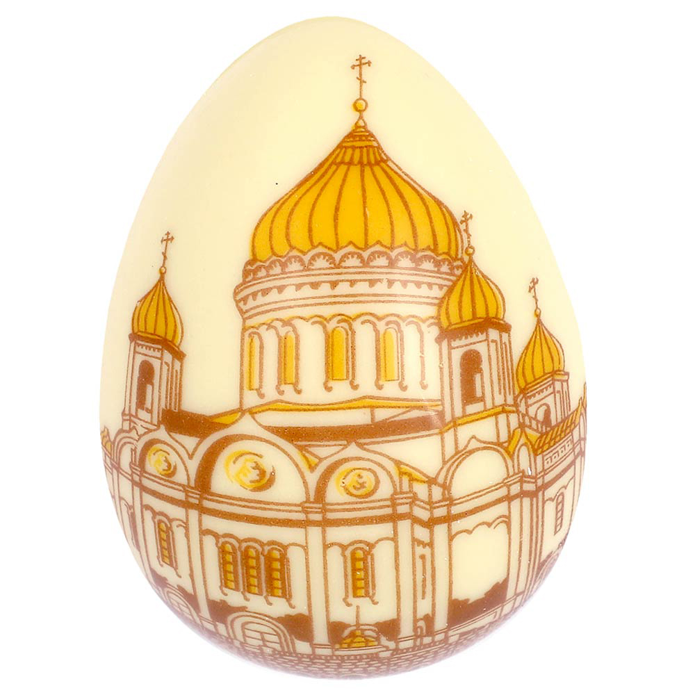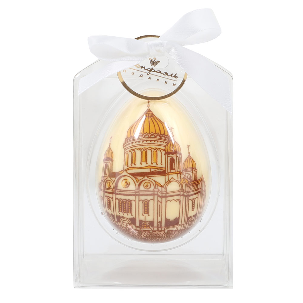 Праздничная упаковка с яйцом из натурального шоколада с изображением храма Христа Спасителя, - идеальный подарок и вкусный десерт для ваших близких и на Пасху, и в качестве сувенира!