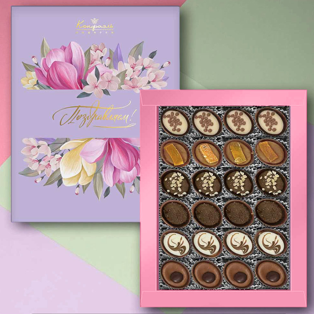 Подарите незабываемые эмоции — выберите набор конфет ручной работы в сиреневой гамме! Это не просто сладости, а искреннее выражение Ваших чувств, оформленное в изысканной кондитерской композиции.