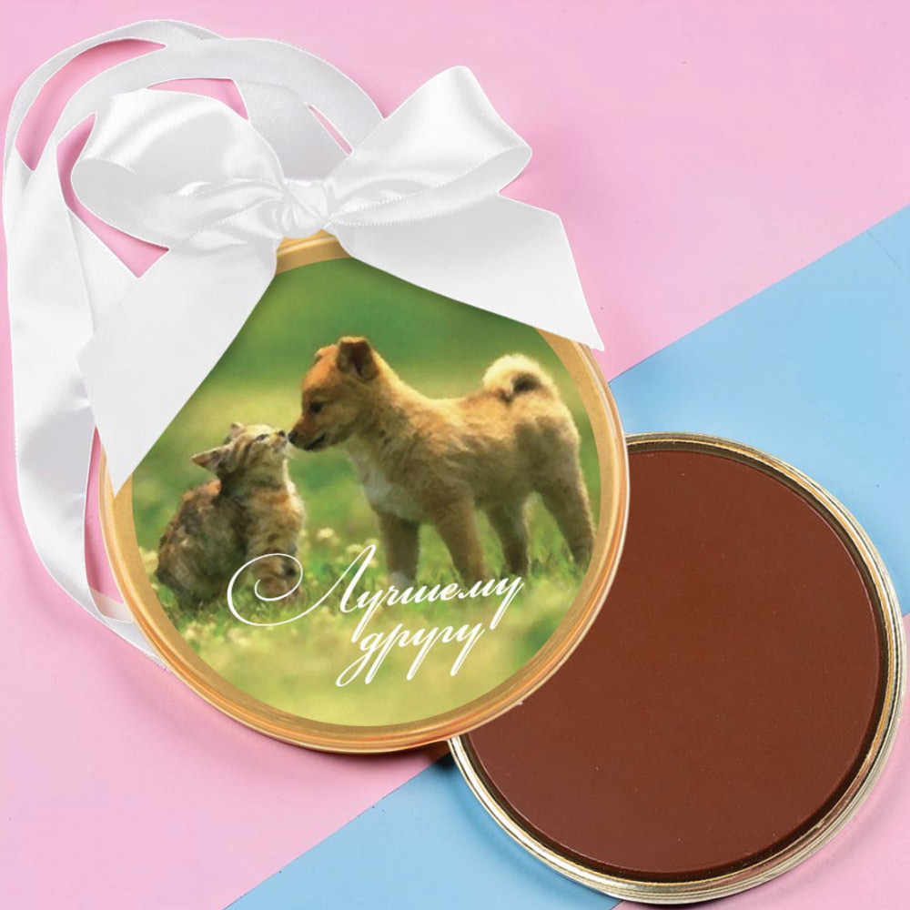 Так вручите же поскорее ему эту весёлую награду - медаль «Лучшему другу», изготовленную из лучших сортов молочного шоколада и упакованную в красивую коробочку с пышным бантом.