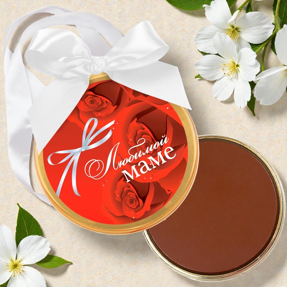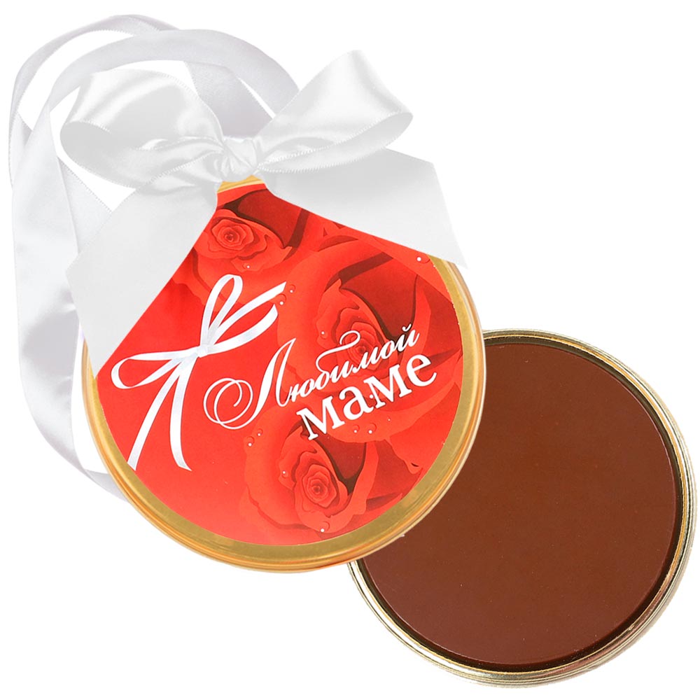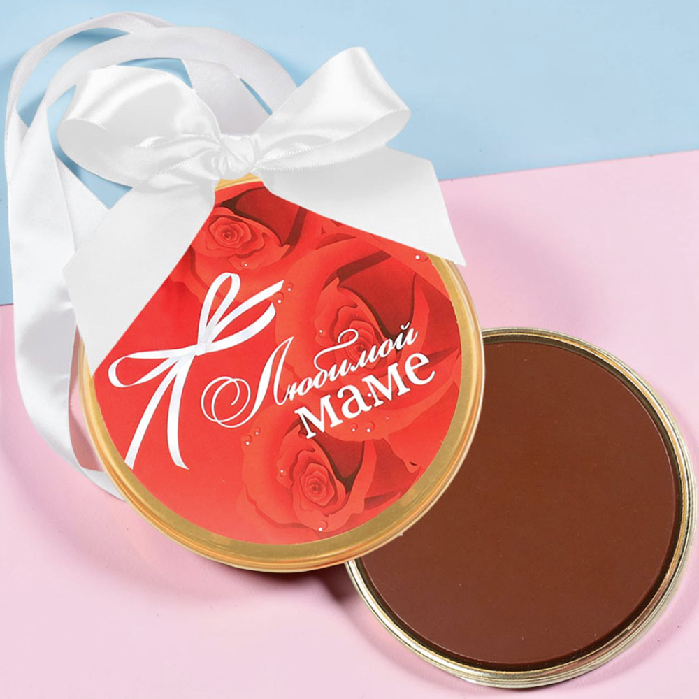 Яркая шоколадная медаль от «Конфаэль» с алыми розами и символичной надписью «Любимой маме» станет не просто лучшей наградой для нее за любовь и ласку, которую она сможет носить на шее, но и сладким лакомством из нежнейшего молочного шоколада.