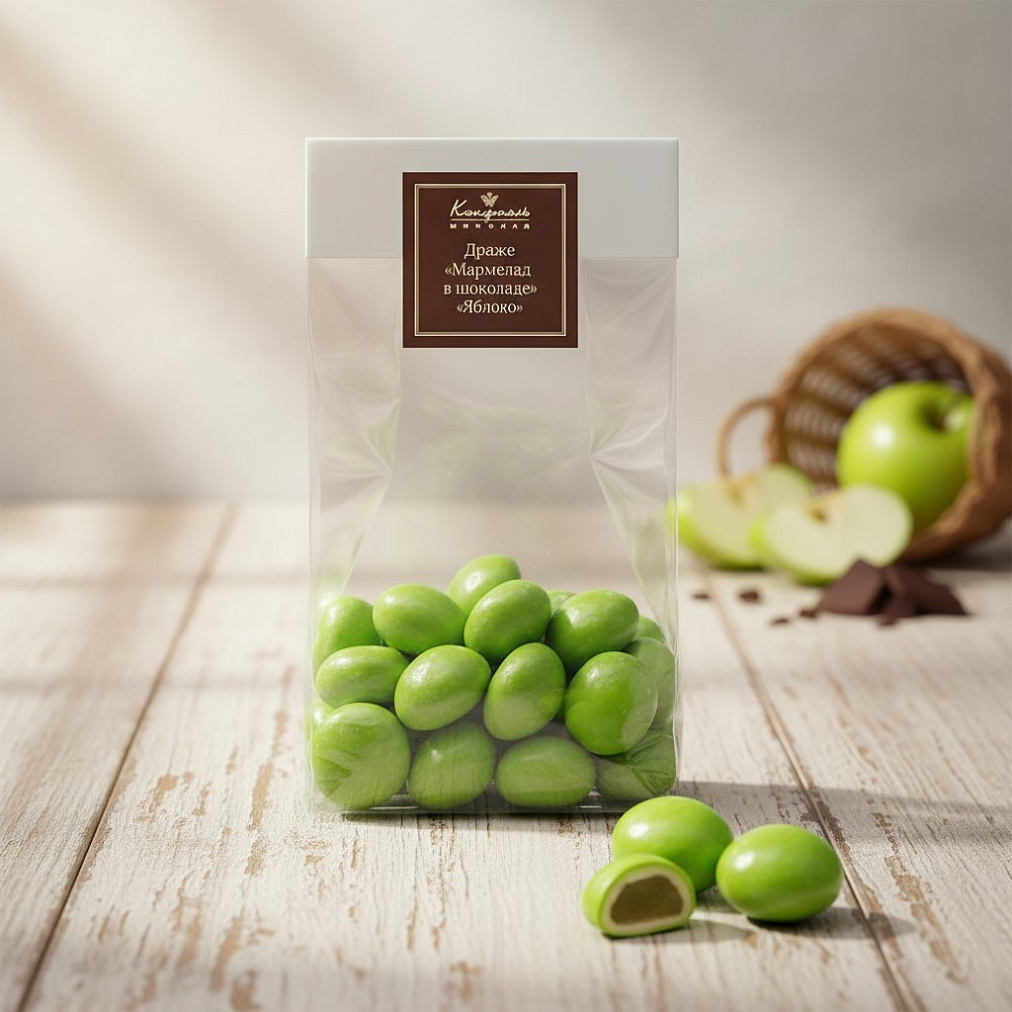 Прозрачная упаковка, не скрывающая своё соблазнительное содержимое - драже мармелад Яблоко в шоколаде, - желанный подарок для ваших близких. Порадуйте же их поскорее!