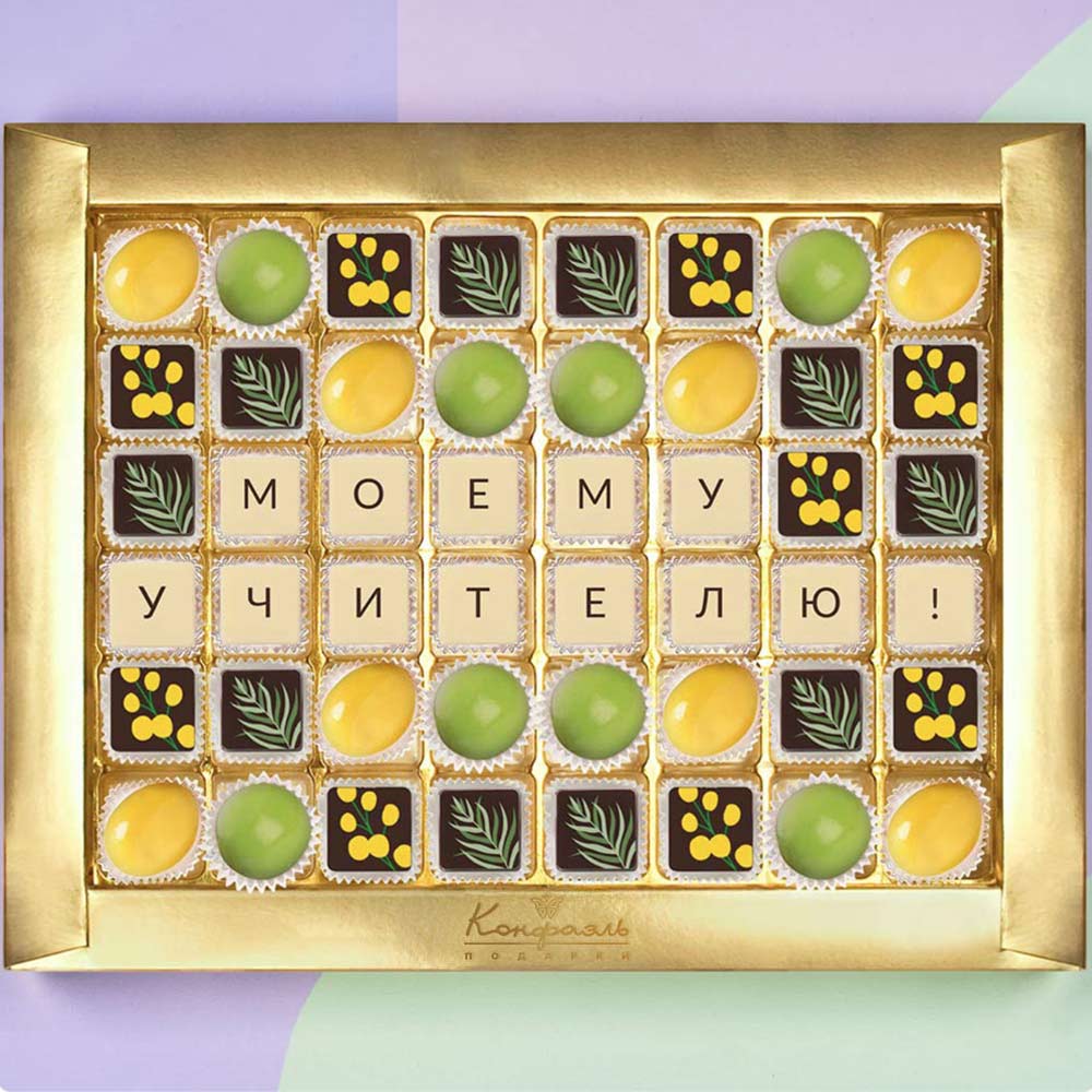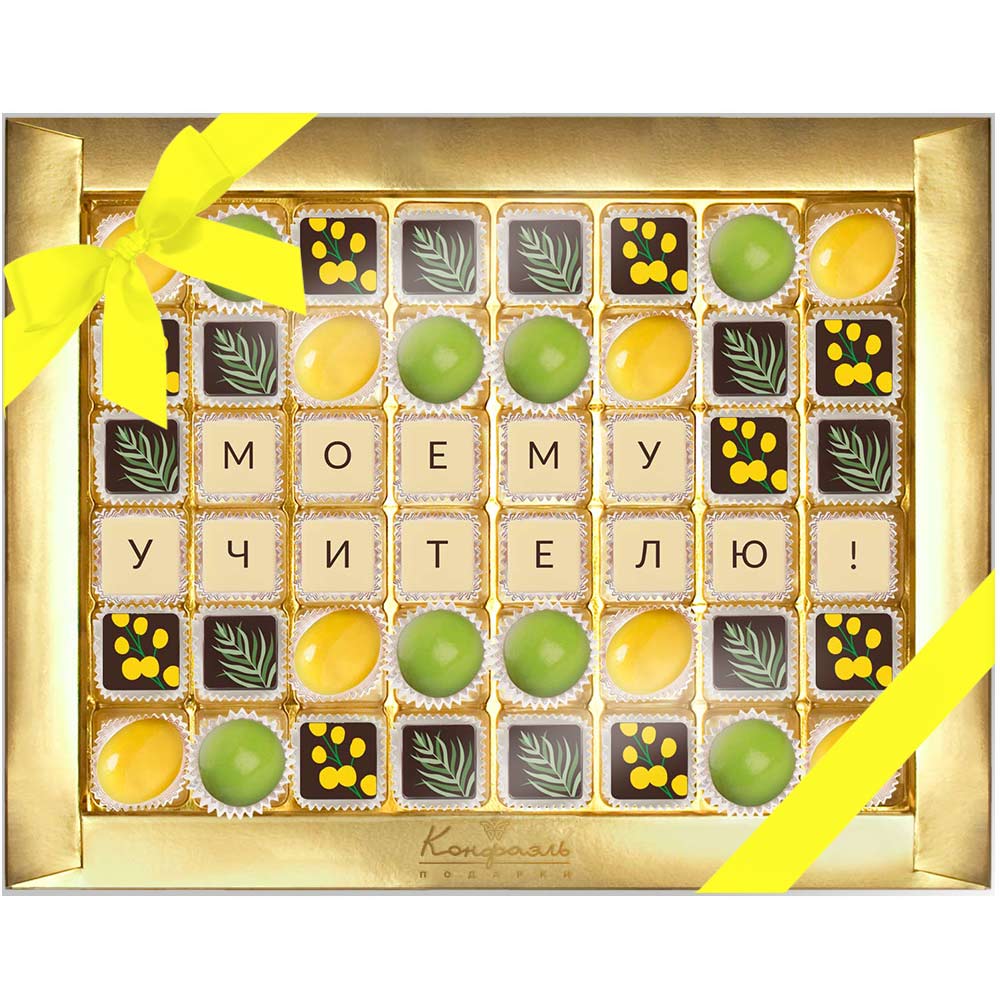 шоколадные массы – какао-масло, какао тертое, сахар, молоко сухое цельное, молоко сухое обезжиренное, лактоза, эмульгатор (лецитин соевый), ароматизатор («Ванилин»); начинки – сахар, патока, глюкозный сироп, какао-масло, какао тертое, молоко сгущенное (молоко цельное, сахар (сахароза, лактоза)), молоко сухое цельное, молоко сухое обезжиренное, лактоза, натуральные концентрированные соки (малиновый, лимонный, черносмородиновый), пюре малины, пюре манго, пюре маракуйи, малина сублимированная, мята сушеная, ядра орехов миндаля, ядра орехов фисташки, марципановая масса, какао порошок, стабилизатор (мальтодекстрин, гуммиарабик), коньяк (дистиллят коньячный, вода, сахар, пищевой краситель «Карамельный колер»), спирт этиловый ректификованный, консервант (сорбиновая кислота), регулятор кислотности (лимонная кислота), эмульгаторы (лецитин соевый, Е471), ароматизаторы, пищевой краситель «Карамельный колер»; декор – пищевые красители (Е132, Е171, Е141, «Куркумин», пищевой краситель (свекольный концентрат)), кандурин зеленый, глазирователь (капол).