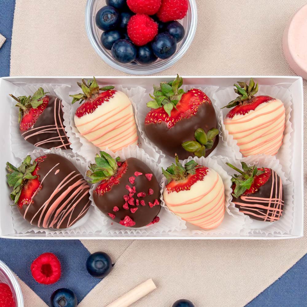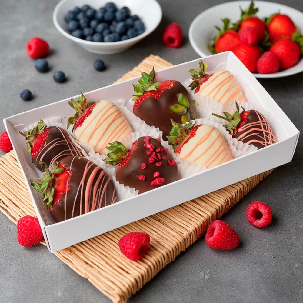 Конфеты глазированные клубника в белом и горьком шоколаде с декором цветным шоколадом, с посыпкой сублимированная малина и орехом фисташки