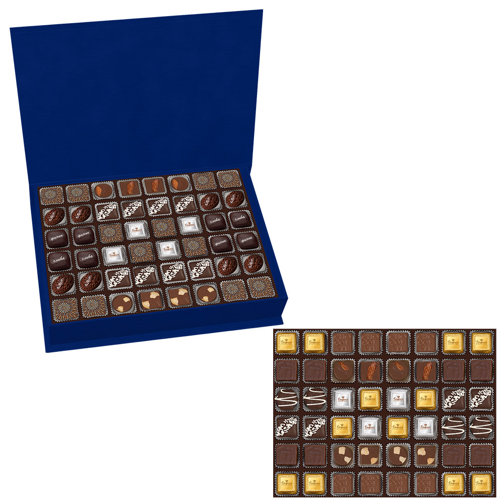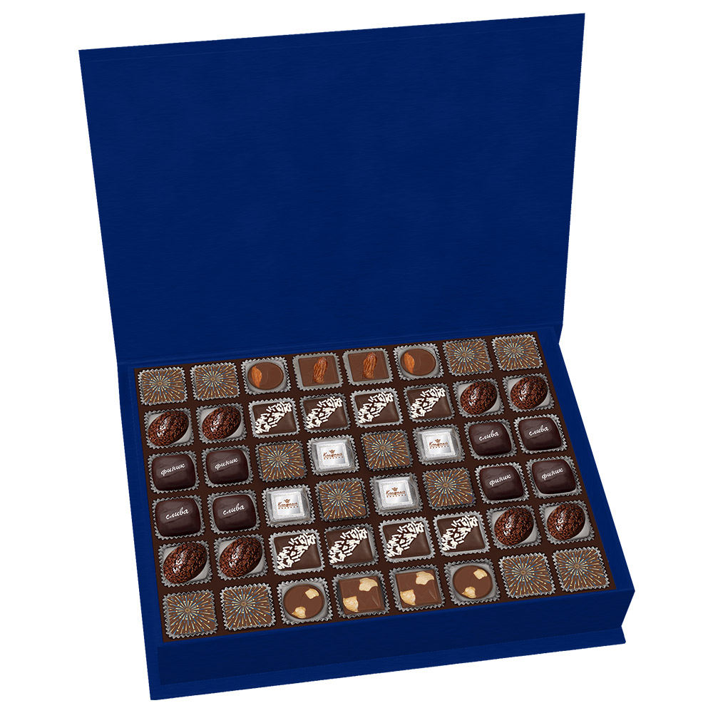 Наслаждайтесь неповторимым сливочным шоколадом с миндалем, фундуком, ассорти начинками, желе апельсиновыми, грильяжем, ананасовым суфле, марципаном и сухофруктами в горьком шоколаде - всего в одном уникальном собрании!