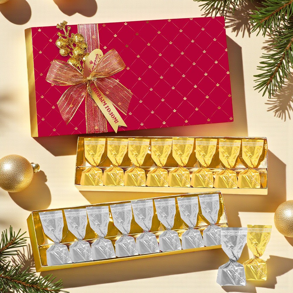 Состав: шоколадная масса – сахар, какао-масло, какао тертое, сыворотка молочная сухая, лактоза, молоко сухое цельное, молоко сухое обезжиренное, эмульгатор (лецитин соевый), ароматизатор («Ванилин»); начинки сахар, патока, какао-масло, какао тертое, молоко сгущенное (молоко цельное, сахар (сахароза, лактоза)), ядра орехов миндаля, стабилизатор (мальтодекстрин), коньяк (дистиллят коньячный, вода, сахар, пищевой краситель «Сахарный колер»), спирт этиловый ректификованный, консервант (сорбиновая кислота), регулятор кислотности (лимонная кислота), эмульгаторы (лецитин соевый, Е471), ароматизаторы. Продукция производится на предприятии, где используются арахис, кунжут, орехи, яичные и молочные продукты, злаки, содержащие глютен.