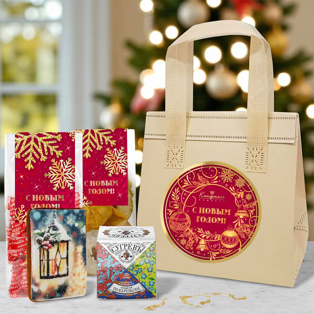 Новогодний набор: конфеты, фруктовые чипсы, пряник, чай 325г в термопакете