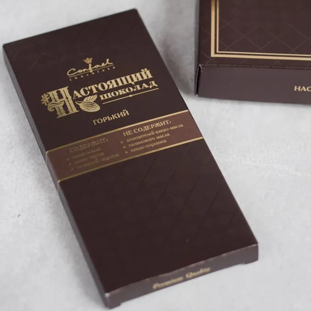 Настоящий горький шоколад. В составе настоящего шоколада - какао-масло, какао тертое, полезный лецитин. Натуральный шоколад не содержит заменителей какао-масла, пальмового, масла ши и других вредных жиров, а также какао-порошка, что отличает "Конфаэль" от большинства современных производителей.