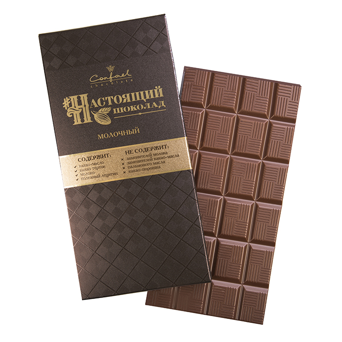 Натуральный шоколад не содержит заменителей какао-масла, пальмового, масла ши и других вредных жиров, а также какао-порошка, что отличает "Конфаэль" от большинства современных производителей.