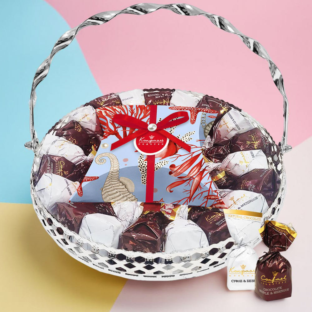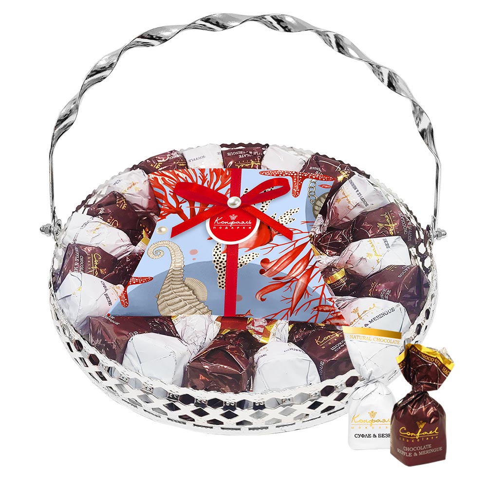 Подарочная корзина с двуслойными конфетами суфле со вкусом манго и суфле-безе 395г