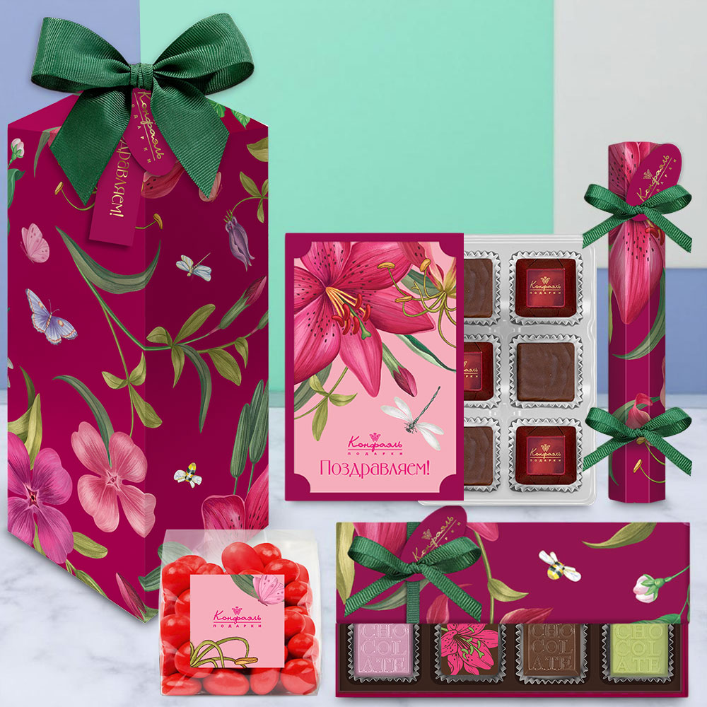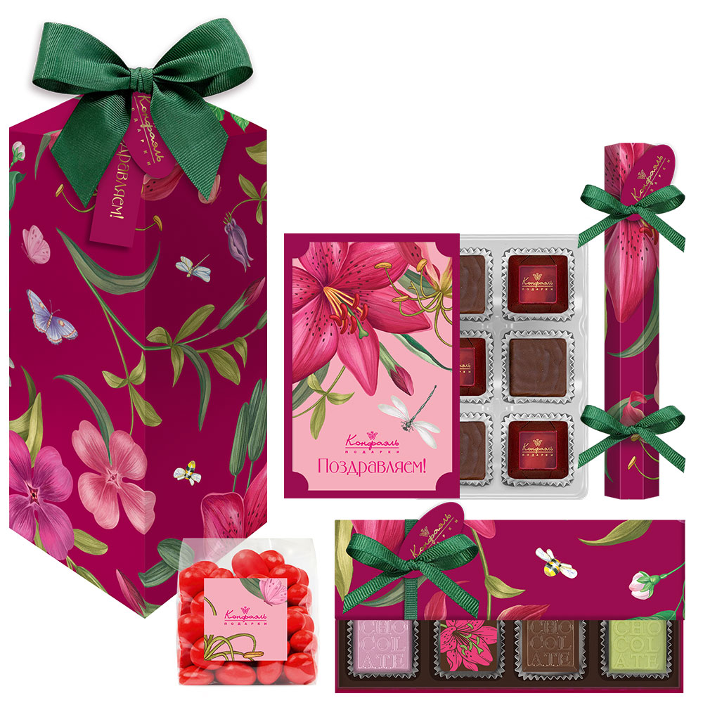 Поздравление 06/ Шоколадные конфеты «Ассорти» со сливочными начинками, конфеты «Суфле» в горьком шоколаде со вкусом «Игристого розе»/ 45г