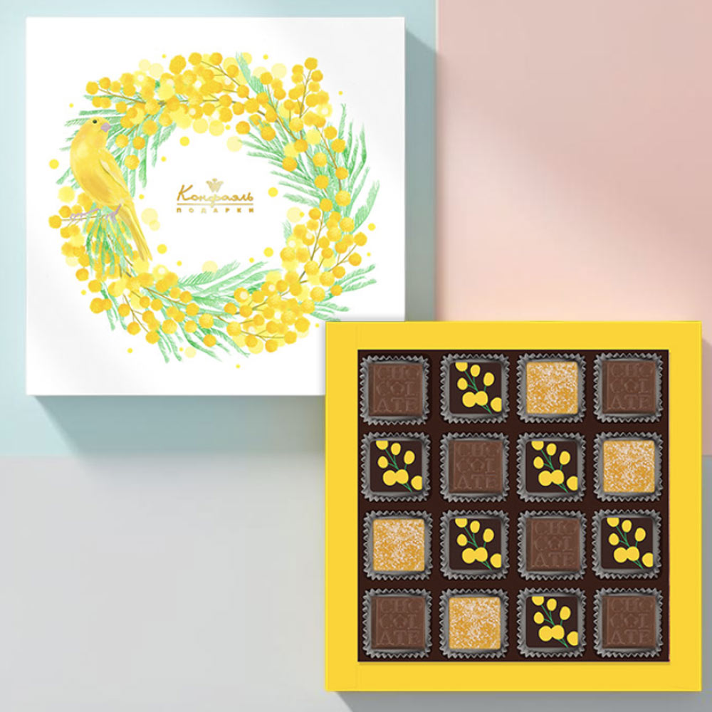 Состав: шоколадные массы – какао-масло, какао тертое, сахар, молоко сухое цельное, эмульгатор (лецитин соевый), ароматизатор («Ванилин»); начинки – сахар, патока, какао-масло, какао тертое, молоко сгущенное (молоко цельное, сахар (сахароза, лактоза)), молоко сухое, масла растительные рафинированные дезодорированные (подсолнечное, рапсовое, оливковое; масло сливочное (из пастеризованных коровьих сливок), молоко сухое обезжиренное), натуральные концентрированные соки (апельсиновый, лимонный), стабилизатор (мальтодекстрин, гуммиарабик), желирующие агенты (агар, желатин), коньяк (дистиллят коньячный, вода, сахар, натуральный пищевой краситель «Карамельный колер»), спирт этиловый ректификованный, консервант (сорбиновая кислота), регулятор кислотности (лимонная кислота), эмульгаторы (лецитин соевый, Е471), ароматизаторы; декор – пищевые красители (Е141, «Куркумин»). Продукция производится на предприятии, где используются арахис, кунжут, орехи, яичные и молочные продукты, злаки, содержащие глютен.