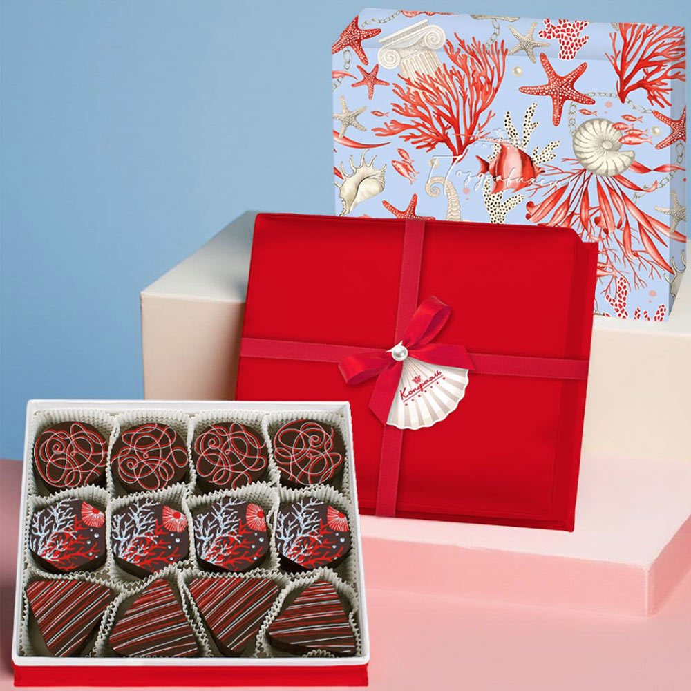 Состав: шоколадная масса – сахар, какао тёртое, масло какао, эмульгатор (лецитин соевый), ароматизатор; начинки – сахар, патока, молоко сгущенное (молоко цельное, сахар (сахароза, лактоза)), масло сладко-сливочное, какао-порошок, желирующий агент (агар), яичный белок, регулятор кислотности (лимонная кислота), консервант (сорбиновая кислота), эмульгаторы (Е471), ароматизаторы, натуральный пищевой краситель («сахарный колер»); натуральный экстракт ванили, натуральный экстракт кофе; декор – пищевые красители (Е171, красный свекольный). Продукция производится на предприятии, где используются арахис, кунжут, орехи, яичные и молочные продукты, злаки, содержащие глютен.