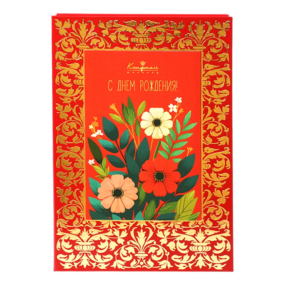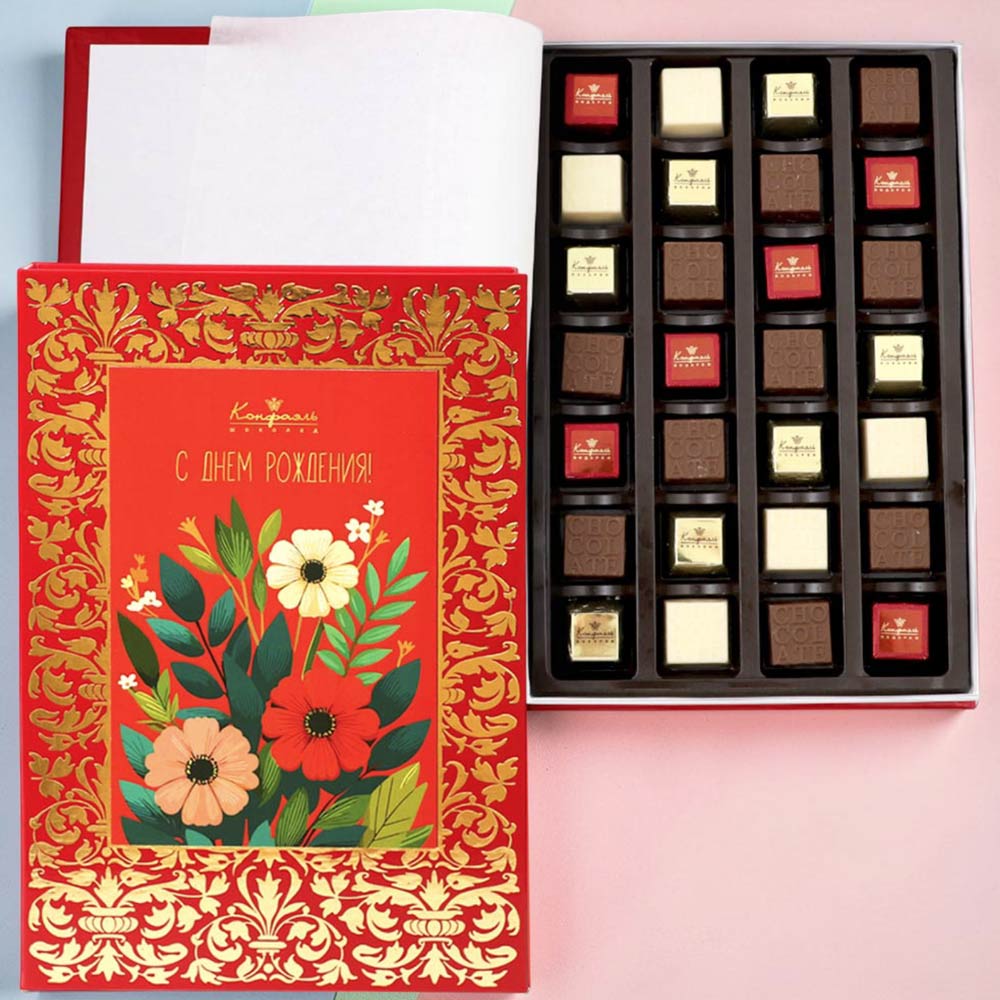 Cостав: шоколадные массы – сахар, масло какао, молоко цельное сухое, сухое обезжиренное молоко, какао тертое, какао-порошок, сыворотка молочная сухая, пахта сухая, молочный жир, паста ореховая из ядер фундука, эмульгаторы (соевый лецитин, Е476), соль, натуральная ваниль, ароматизаторы; начинки – сахар, патока, какао-масло, какао тертое, молоко сгущенное (молоко цельное, сахар (сахароза, лактоза)), жир специального назначения (масло ши, рапсовое масло, соевое масло, антиокислитель (лимонная кислота)), молоко сухое цельное, молоко сухое обезжиренное, белый шоколад (сахар, масло какао, сухое обезжиренное молоко, сухое цельное молоко, эмульгатор (лецитин соевый), экстракт ванили), масла растительные рафинированные дезодорированные (подсолнечное, рапсовое, оливковое; масло сладко-сливочное, молоко сухое обезжиренное), стабилизатор (мальтодекстрин), коньяк (дистиллят коньячный, вода, сахар, пищевой краситель (сахарный колер)), консервант (сорбиновая кислота), регулятор кислотности (лимонная кислота), эмульгаторы (лецитин соевый, Е471), ароматизаторы, пищевые красители (сахарный колер)