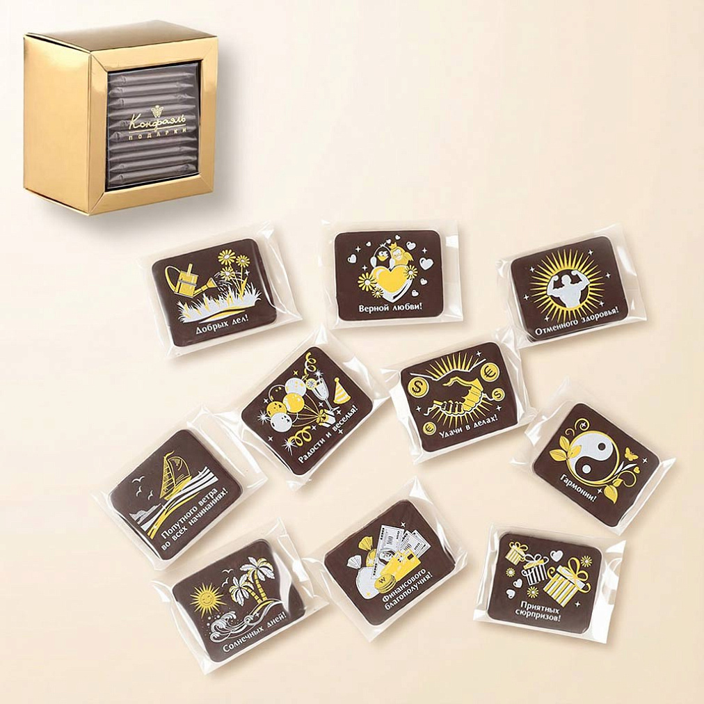 На каждой из 10 шоколадных плиток выгравированы напутственные слова, которые созвучны с желаниями каждого человека.