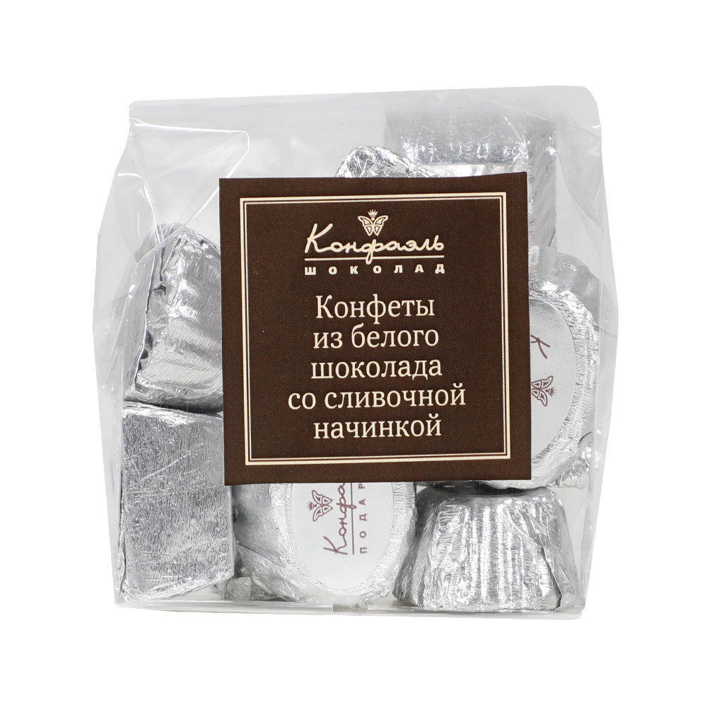"Конфеты из белого шоколада со сливочными начинками ( серебряная фольга, микс)/90г"