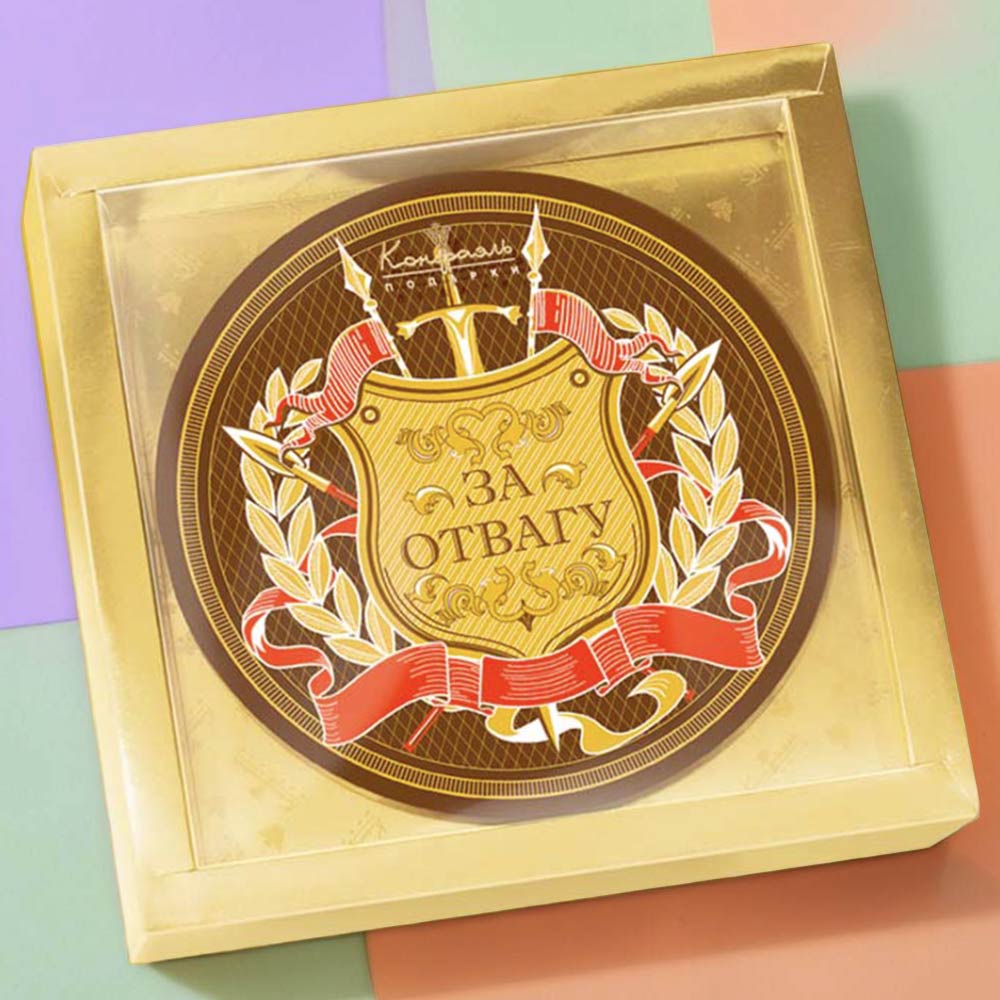 Торжественная медаль «За отвагу!» из молочного шоколада, диаметром 30 см - для вашего мужчины! Дарите ему десерты почаще - и он будет совершать чудеса самопожертвования ради вас и семьи.