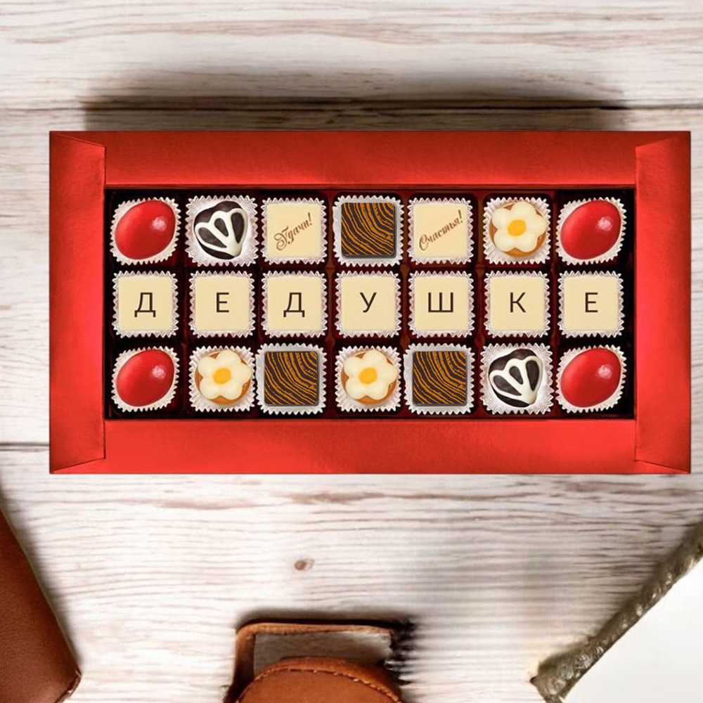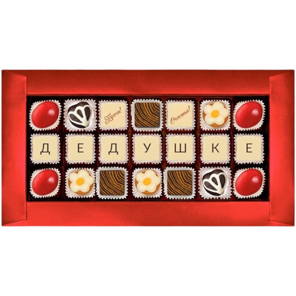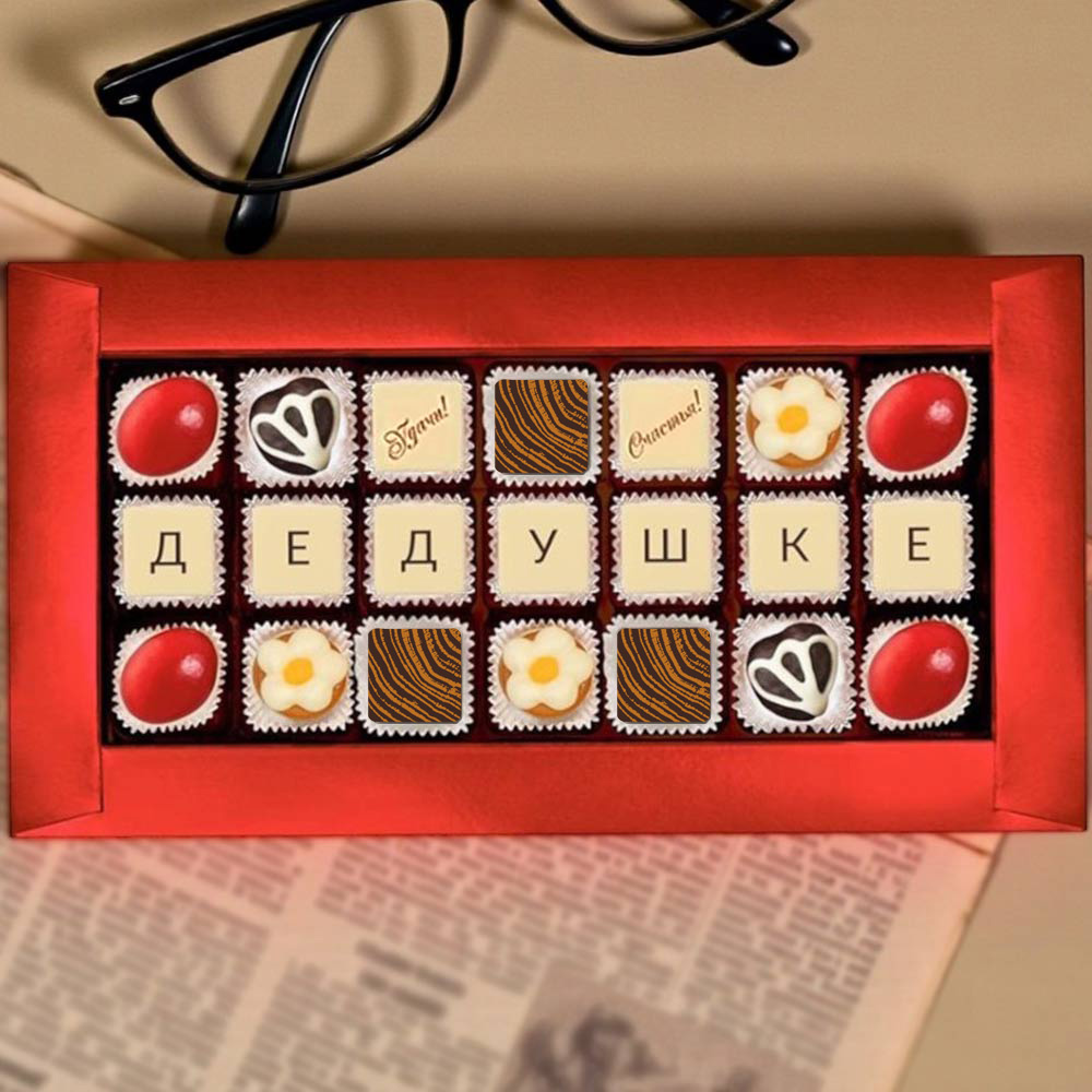 Шокотелеграмма "Дедушке", с вкуснейшими конфетами с желейными, сливочными и шоколадными начинками, послужит прекрасной причиной для очередных семейных посиделок за чашечкой чая.