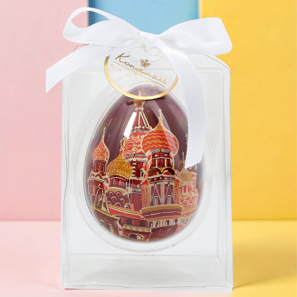 Поэтому шоколатье «Конфаэль» создали универсальный сувенир - десертное яйцо из молочного шоколада «Собор Василия Блаженного», упакованное в праздничный футлярчик.
