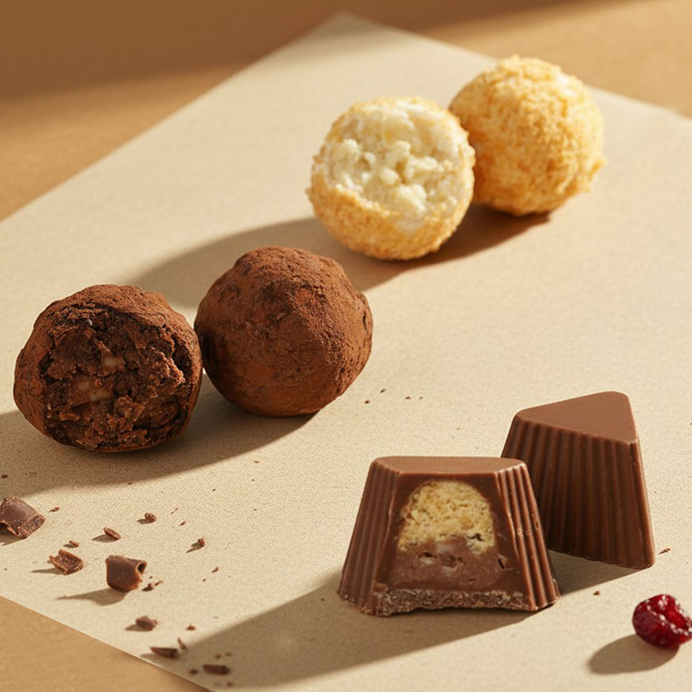 Нежные трюфели в клубничной и вафельной крошке, конфеты в лимонном и розовом шоколаде, классические сочетания шоколада, какао и карамели — каждая конфета создана вручную мастерами фабрики и отличается гармоничным балансом сладости и благородной сырной пикантности.