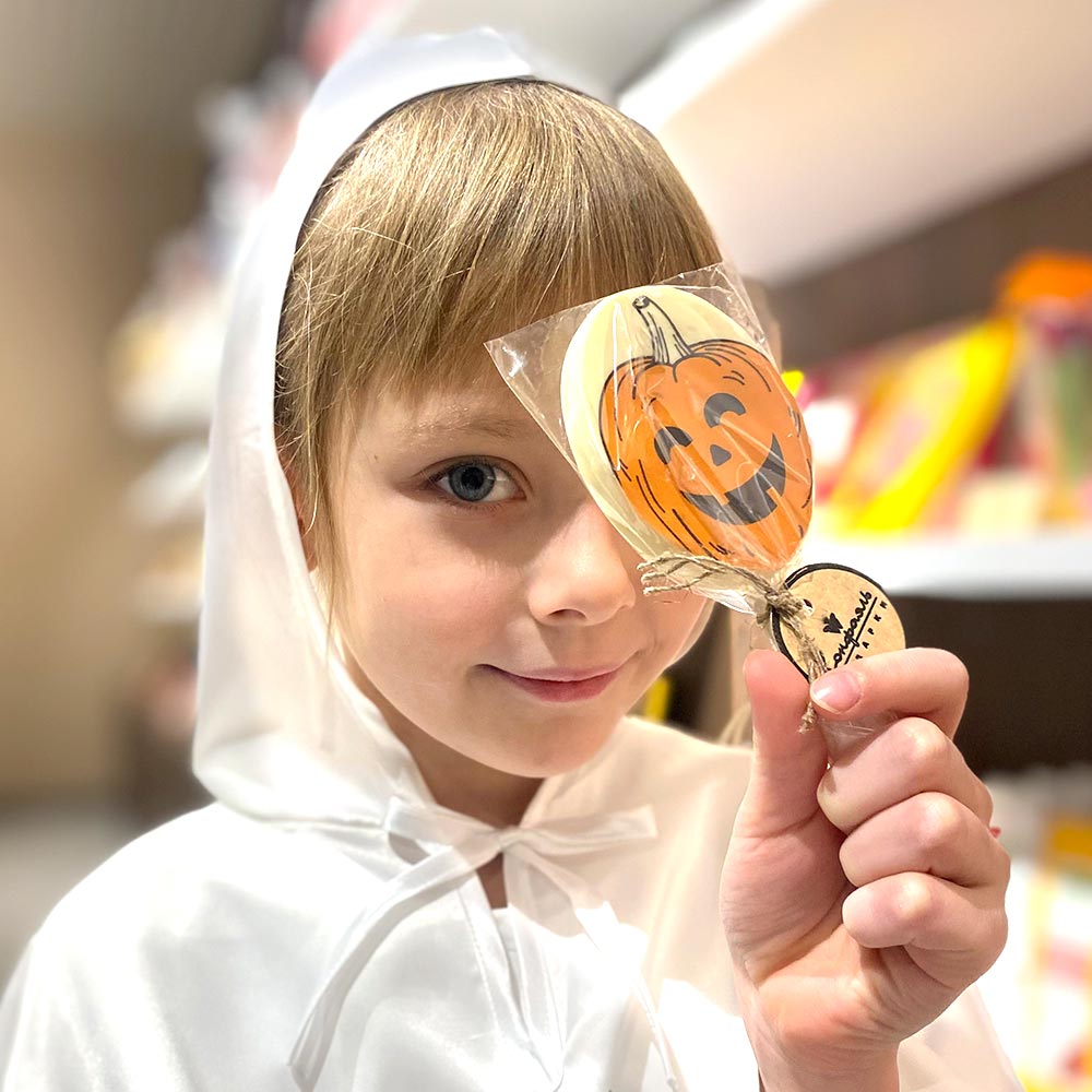 Угощение или жизнь? Так обычно выпрашивают сладости на Хэллоуин Конечно же угощение! Этот очаровательный леденец из белого шоколада обязательно понравится Вашему ребенку! Скоротайте осенний вечер за поеданием сладостей от Конфаэль!