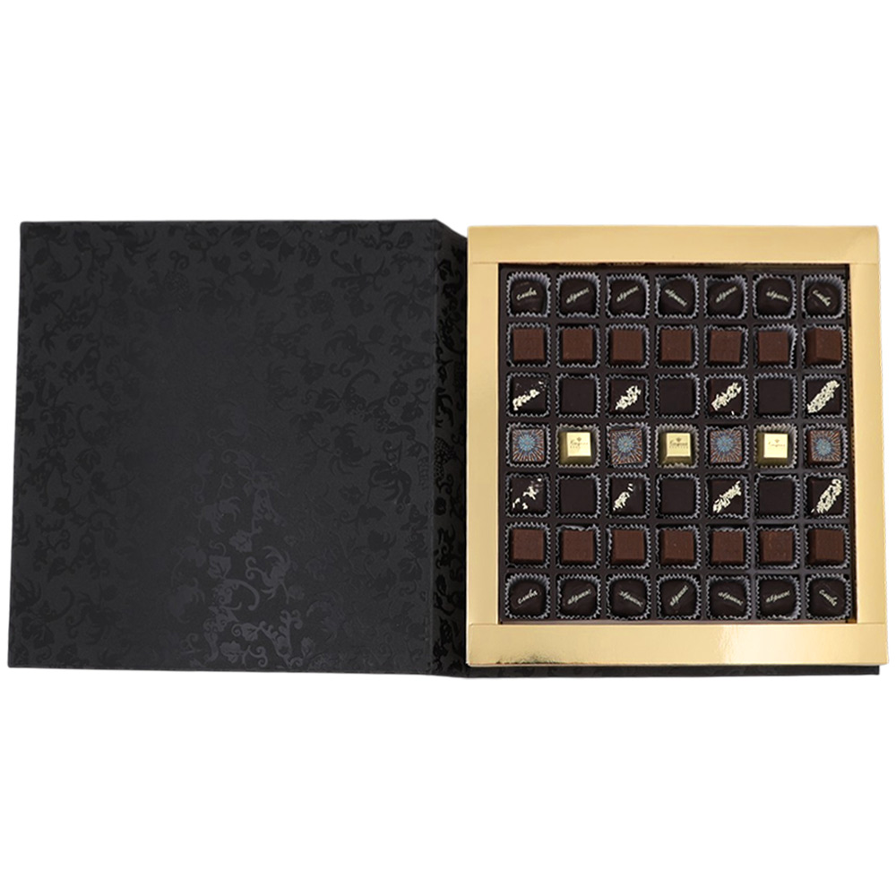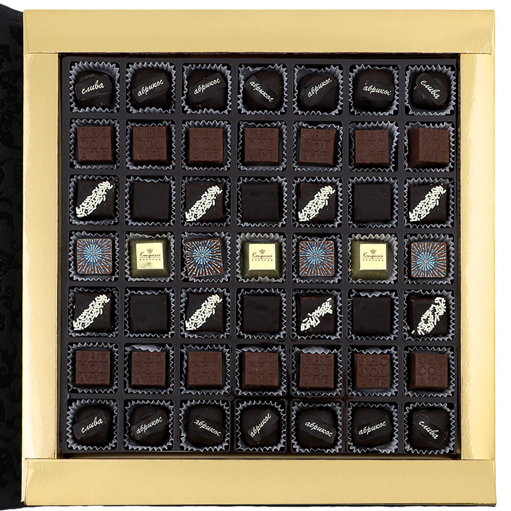 Шоколадные конфеты «Ассорти» со сливочными и шоколаданой начинками, с кремовой начинкой и декором ( "Шампанское и ананас"), конфеты «Суфле» в горьком шоколаде (ванильное),конфеты «Мягкий грильяж» в горьком шоколаде, конфеты «сухофрукты» в горьком шоколаде с декором(финик, слива, абрикос)