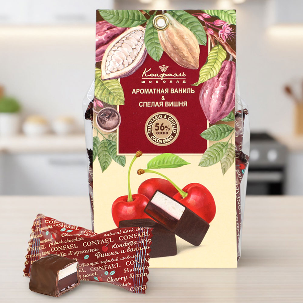 шоколадная масса - какао тертое, сахар, какао-масло, эмульгатор (лецитин соевый), ароматизатор ("Ванилин"), начинки - сахар, патока, молоко сгущенное (молоко цельное, сахар (сахароза, лактоза)), масло сладко-сливочное, натуральный концентрированный вишневый сок, яичный белок сухой, желирующие агенты (агар, желатин говяжий), консервант (сорбиновая кислота), регулятор кислотности (лимонная кислота), эмульгатор (Е471), ароматизаторы, натуральный экстракт ванили.