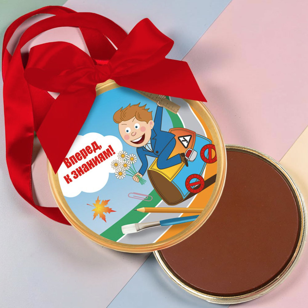 Для этой цели отлично подойдёт медаль «Вперёд к знаниям!», изготовленная из молочного шоколада и привлекающая детское внимание своим жизнерадостным дизайном.
