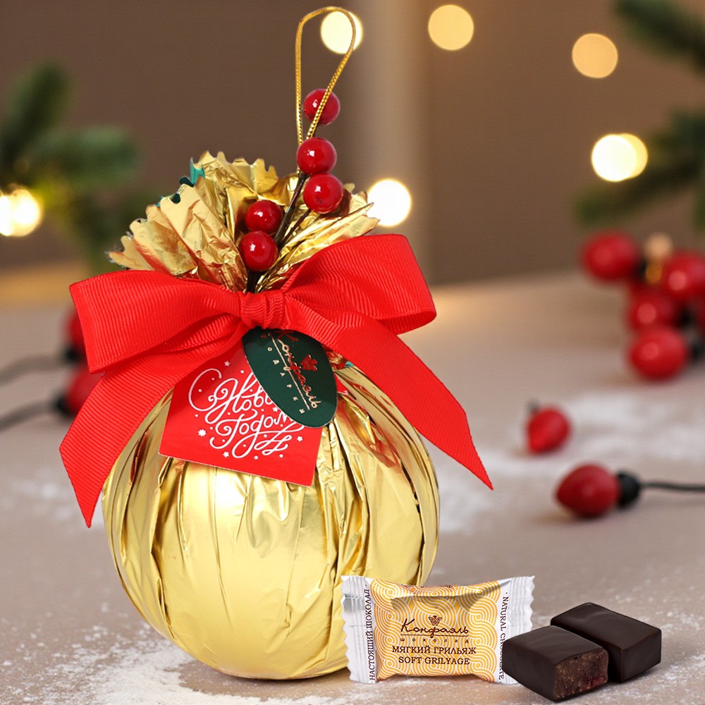 Ёлочный шар с конфетами мягкий грильяж золотой 110г