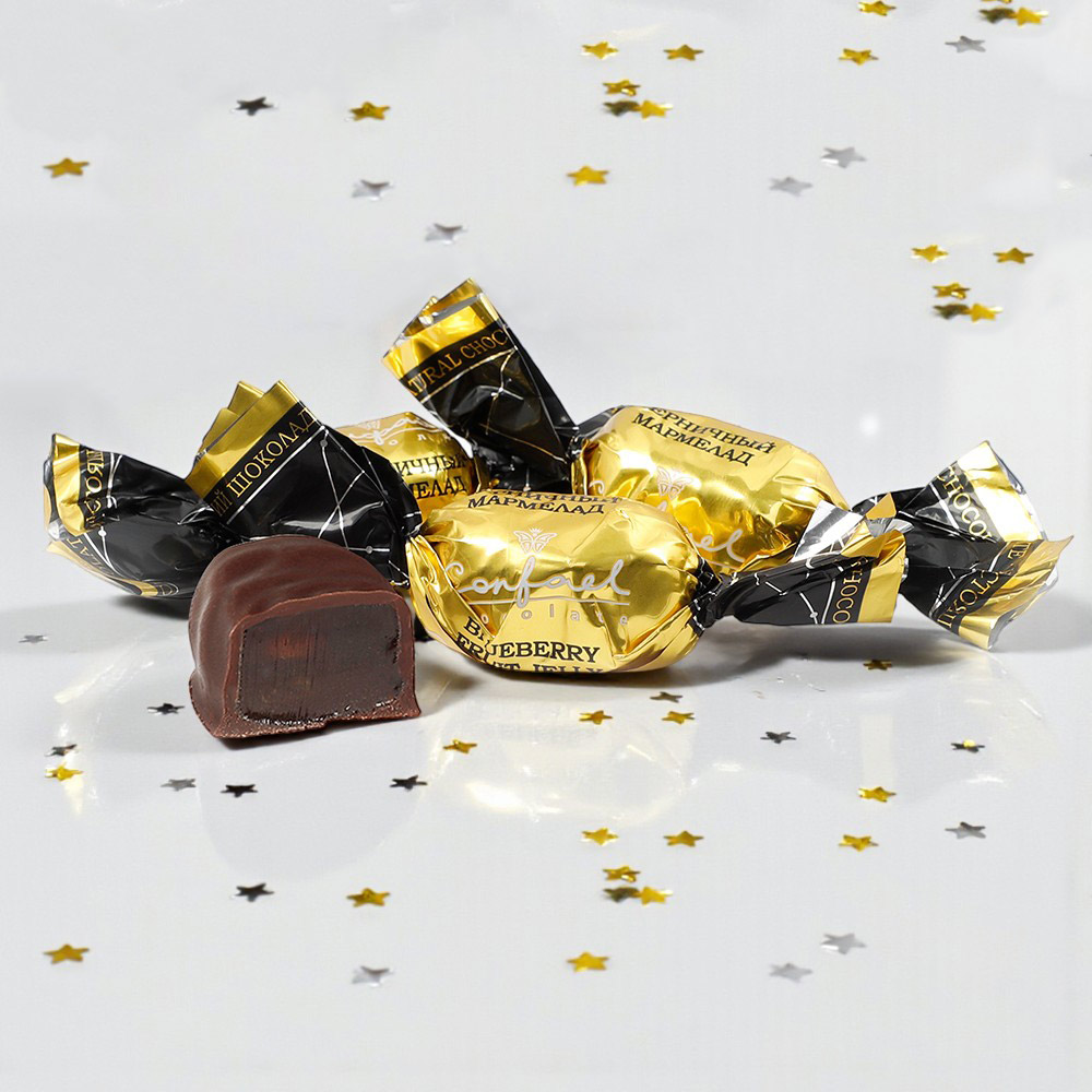 Конфеты «Суфле» в горьком шоколаде (шоколадное), конфеты «Желейные» в горьком шоколаде (черничные), конфеты «Мягкий грильяж» в горьком шоколаде