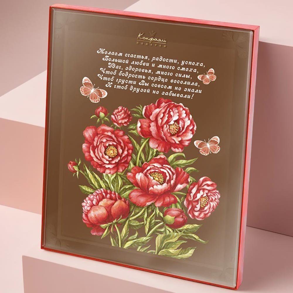 Премиальный молочный шоколад, который так нравится всем любителям качественных какао-продуктов, оригинальное изображение красивого букета пионов, над которым порхают бабочки, и теплые слова пожелания счастья – три слагаемых этого трогательного подарка.